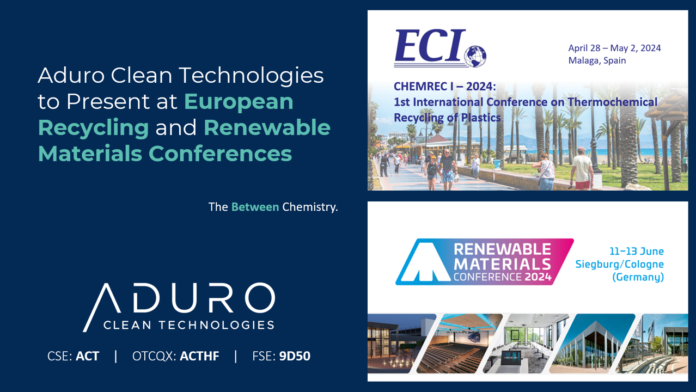 Aduro Clean Technologies Inc. (“Aduro” or the “Company”) (CSE: ACT) (OTCQX: ACTHF) (FSE: 9D50), a Canadian technology company using the power of chemistry to transform lower value feedstocks, like waste plastics, heavy bitumen, and renewable oils, into resources for the 21st century, is pleased to announce its participation at two industry conferences focused on the advancement of advanced chemical recycling and renewable materials.