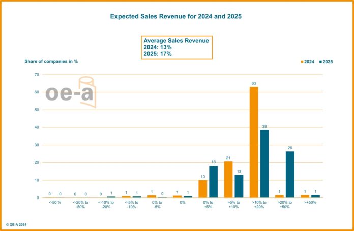 The results of the latest OE-A Business Climate Survey show slightly lower expectations for 2024 compared to the projections made in the 2023 surveys. However, the decline is at a high level: For 2024,responding association members expect a 13 percent increase in revenue for the flexible and printed electronics industry. “Our industry is even more confident in 2025, with an estimated growth of 17 percent. The relatively young Printed Electronics industry has come a long way in the last 15years. I am convinced that we are on the right track, despite the challenging geopolitical situation,” said Dr. Alain Schumacher, OE-A Vice Chairman and Chief Technology Officer at IEE in Luxembourg. The results of the OE-A Business Climate Survey were presented at the
